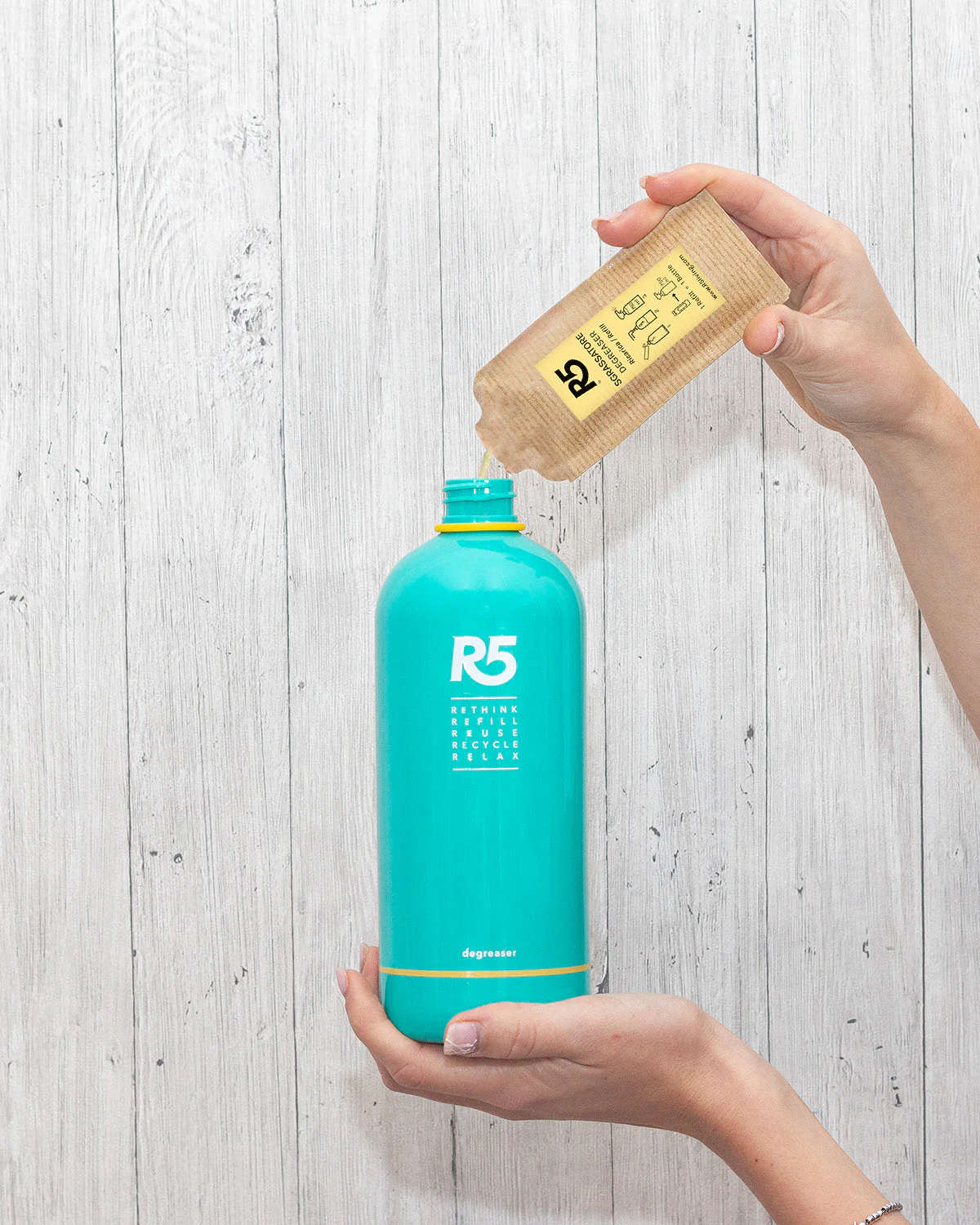 Ogni scatola di R5 Refill Sgrassatore contiene 2 ricariche per la preparazione di 2 flaconi da 750ml di prodotto pronto all’uso.