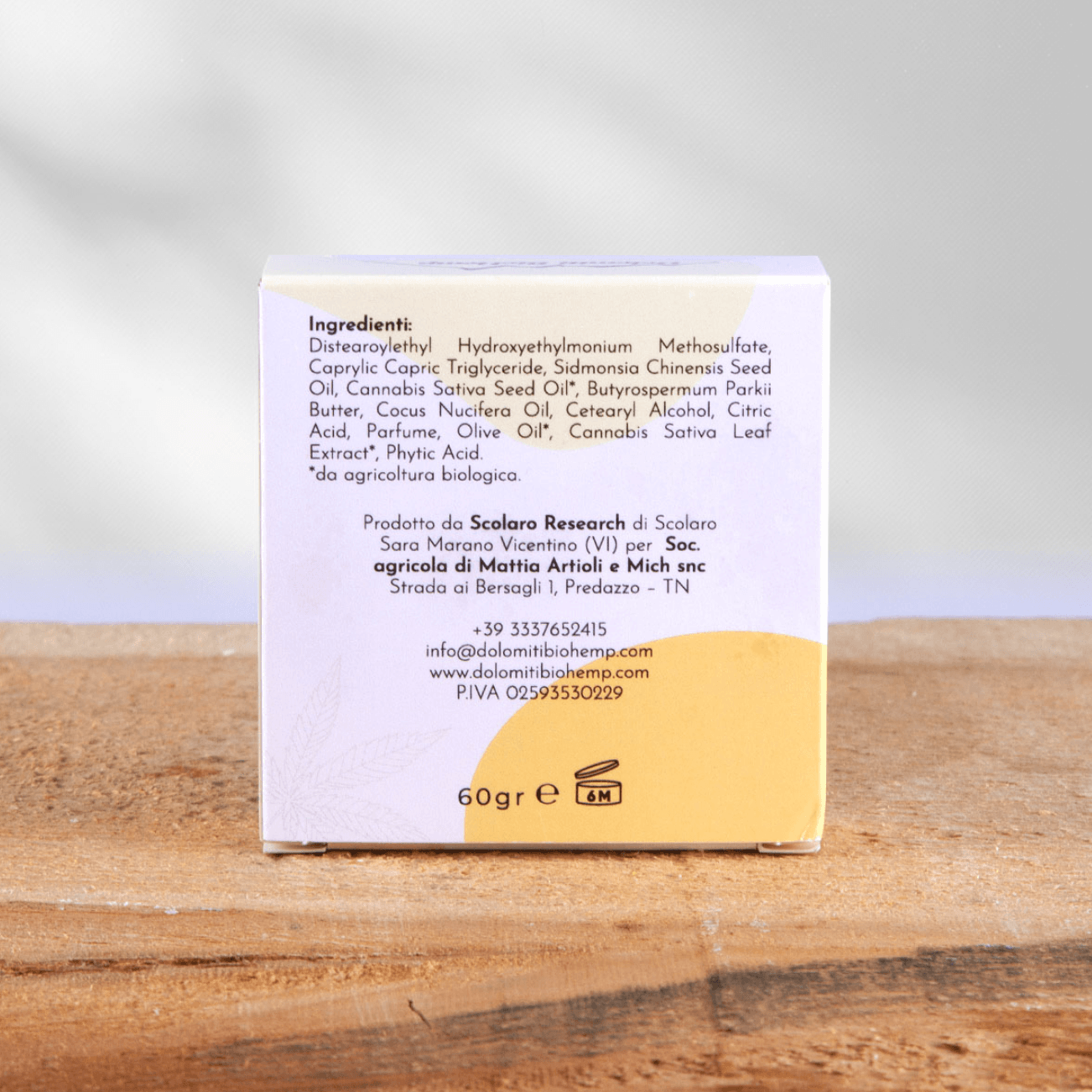 Il balsamo alla canapa è inoltre il prodotto ideale per chi desidera un cosmetico di origine naturale, ipoallergenico, privo di sostanze chimiche e adatto anche alla pelle più delicata. La canapa utilizzata proviene infatti dalla nostra Green House Dolomiti BioHemp, un terreno biologico immerso nell’aria pura delle montagne trentine. Qui tutto viene coltivato senza l’uso di fertilizzanti chimici o altre sostanze nocive per la salute dell’uomo o dell’ambiente. Dalle piante di canapa si ricavano anche l’ingrediente base del balsamo alla canapa, l’olio di semi di canapa. Si tratta di un estratto purissimo a base di CBD, cannabinoide privo di effetti stupefacenti e sempre più apprezzato per le sue tante proprietà.