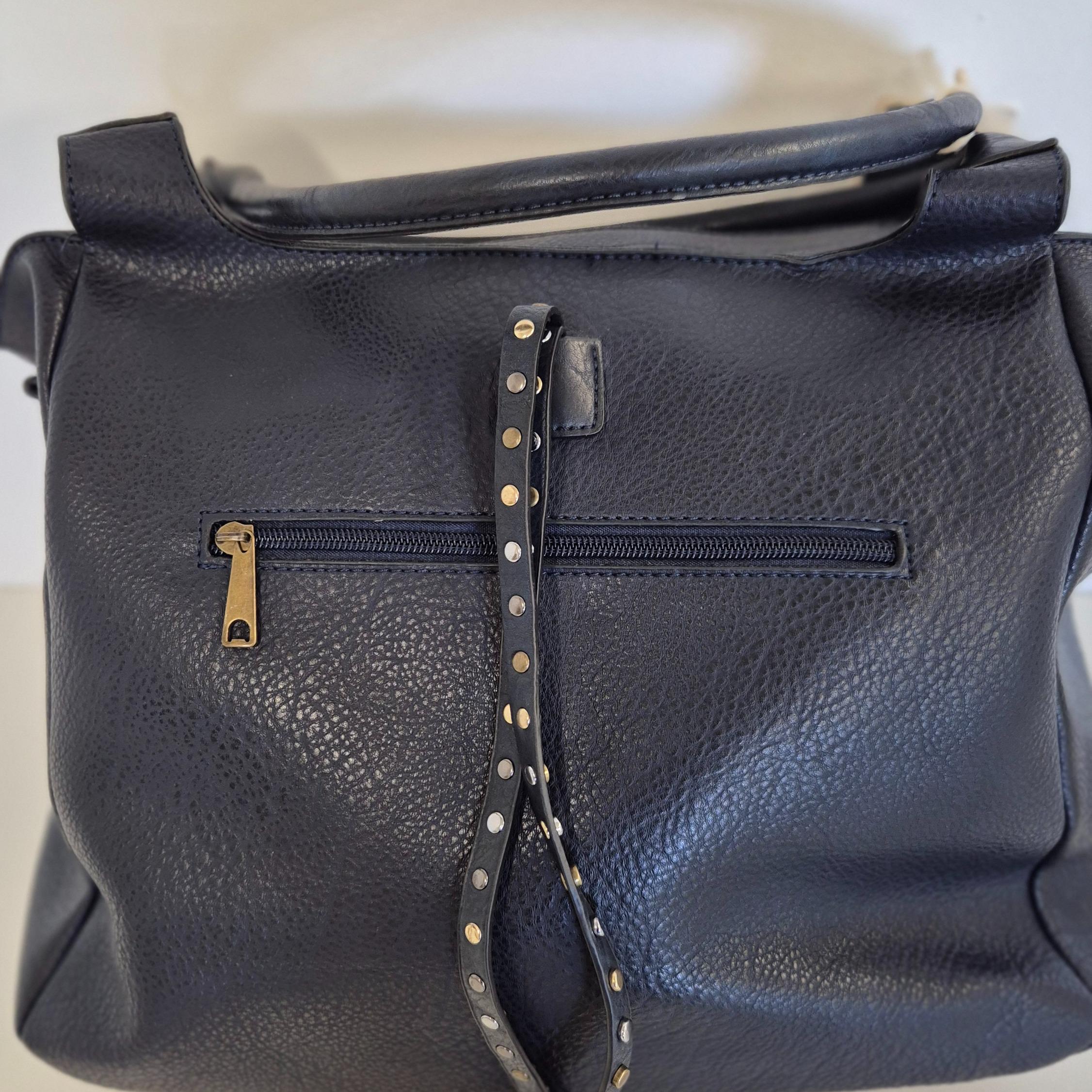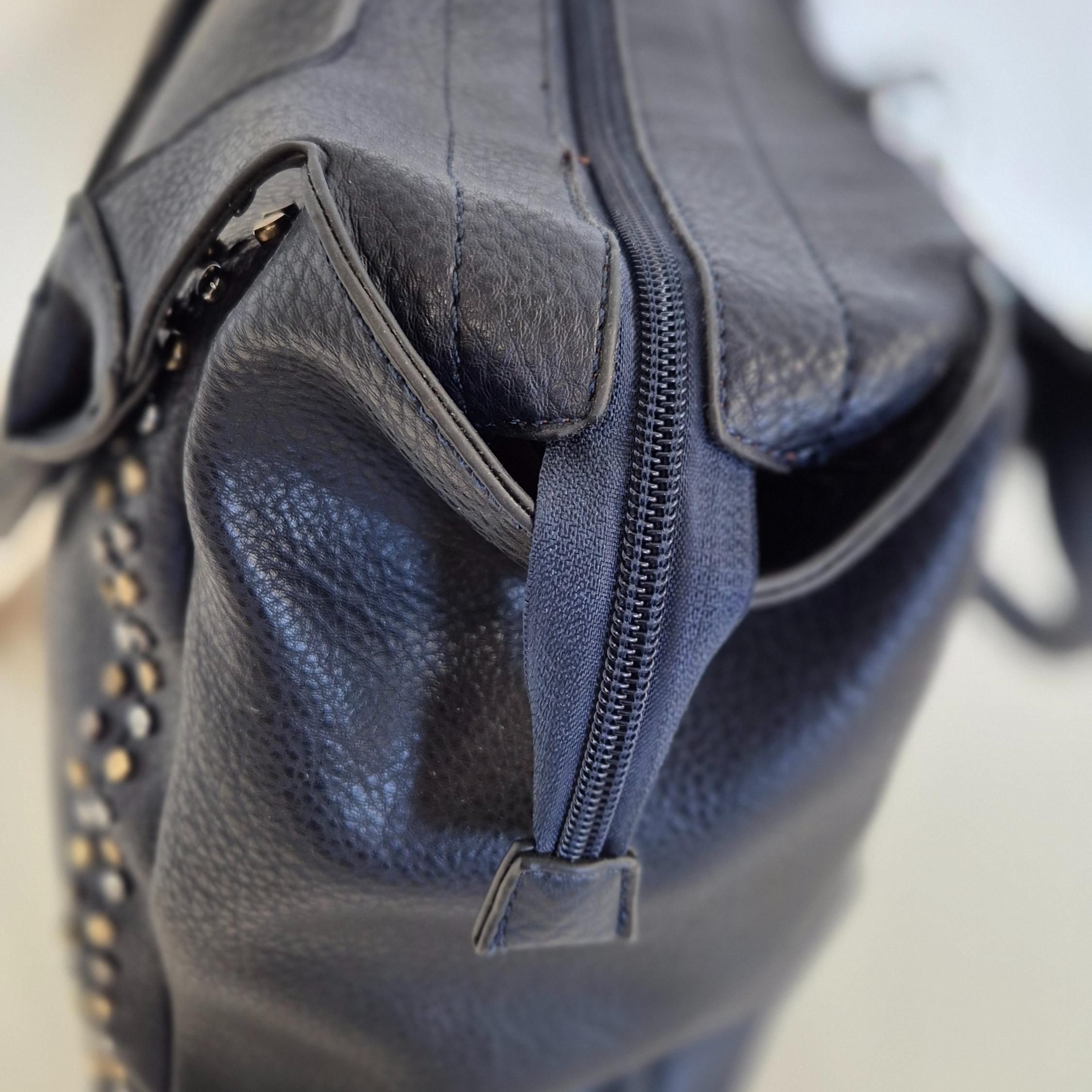 Disegnata in Italia, Stella unisce la funzionalità di una grande borsa everyday alla cura dei dettagli tipica della pelletteria italiana. Ogni borchia, ogni impuntura e la scelta del blu notte raccontano uno stile moderno, sicuro di sé e versatile. È più di una borsa: è un accessorio di personalità, pensato per la donna che vive la città con energia e vuole sentirsi sempre unica.