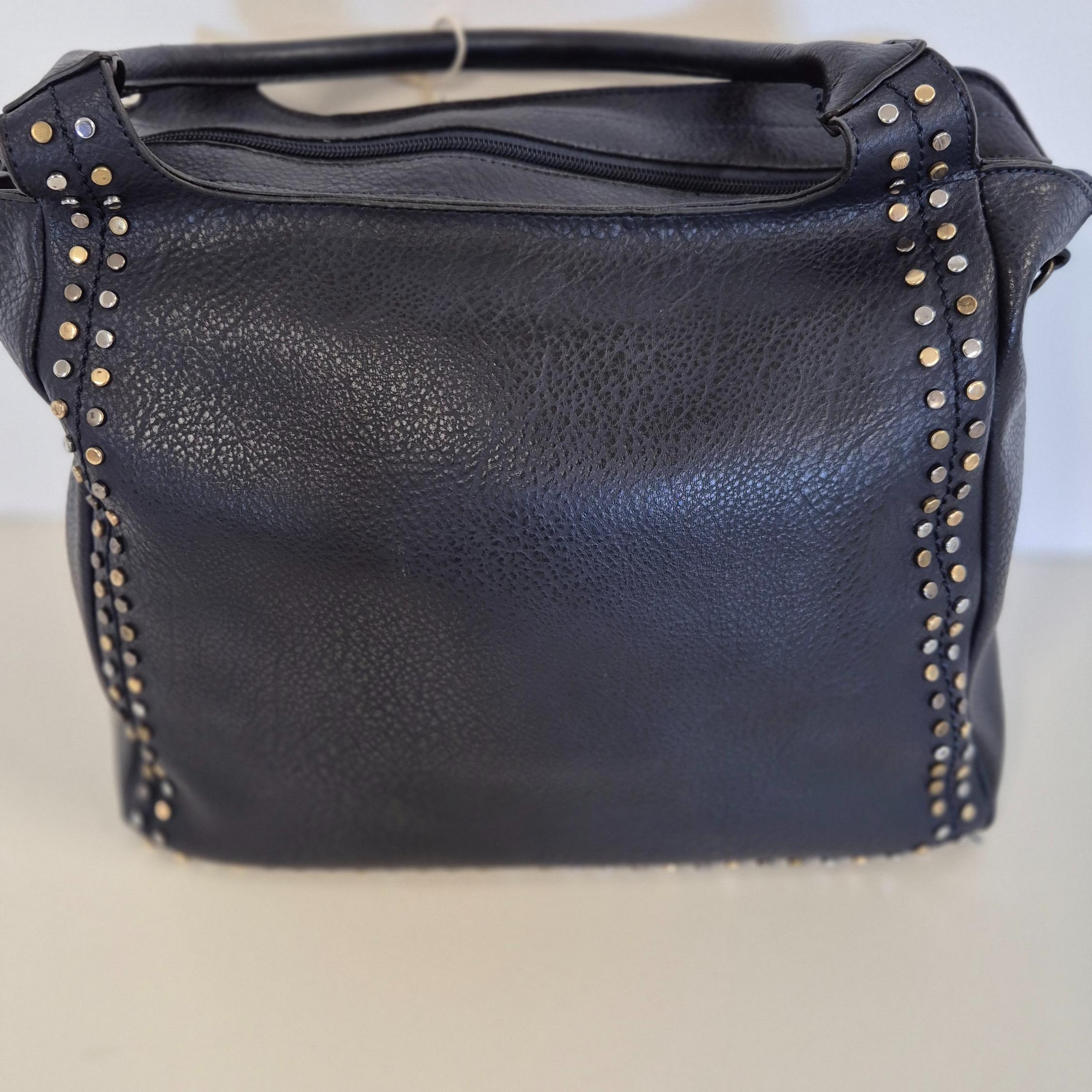 Dettagli: File di borchie metalliche sui lati, cinturino decorativo con micro borchie sul fronte, tasca esterna con zip, cuciture curate