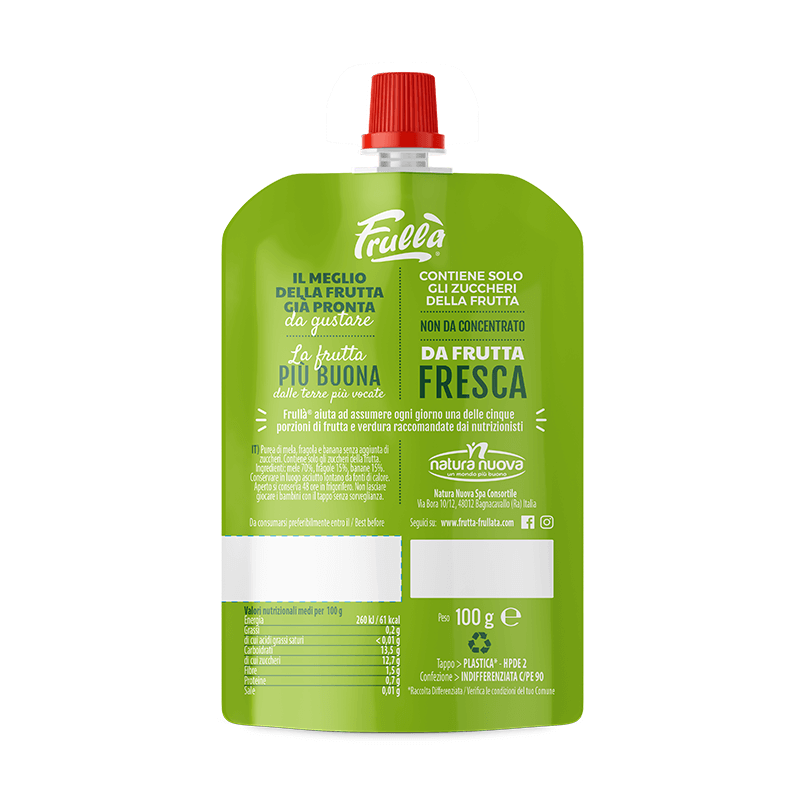 Ingredienti: Mela (70%), banana (15%), fragola (15%)