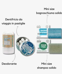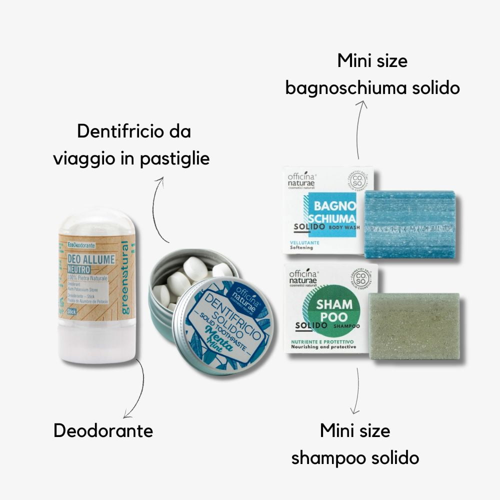 KIT VIAGGIO MINIMAL | Shampoo e Bagnoschiuma mini, Dentifricio in pastiglie, Deodorante