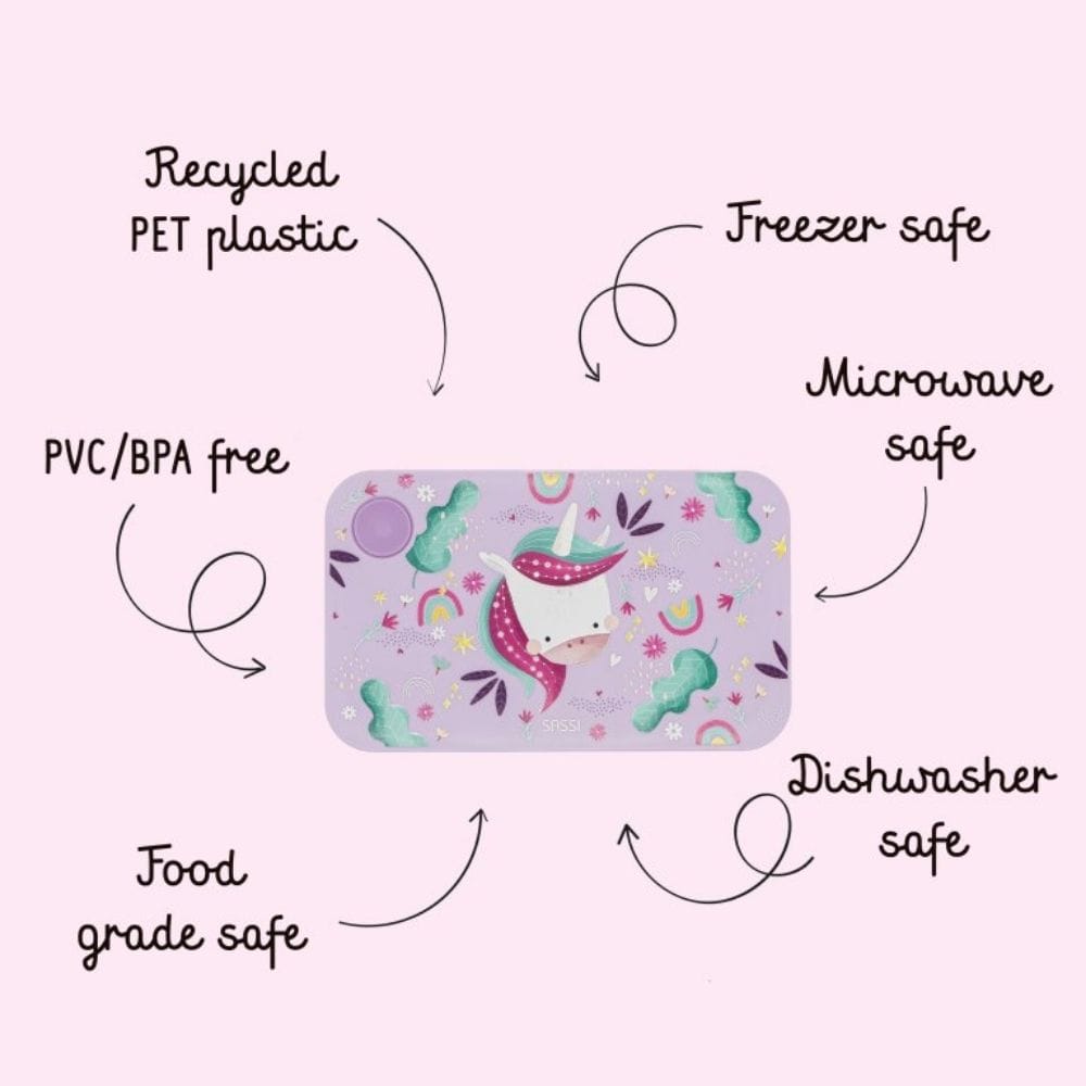 La lunch box in PET alimentare con il grazioso unicorno Sparkly è il compagno perfetto per le giornate dei bambini! Ideale per la scuola, il parco o le gite fuori porta, questa lunch box unisce sicurezza, praticità ed ecosostenibilità in un unico prodotto colorato e divertente.