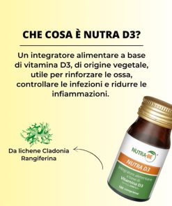NUTRA D3 è un integratore alimentare a base di vitamina D3 che contribuisce al mantenimento di ossa normali, alla normale funzione muscolare, al mantenimento di denti normali, alla normale funzione del sistema immunitario. La vitamina D3 (Colecalciferolo) è nota per il suo ruolo :