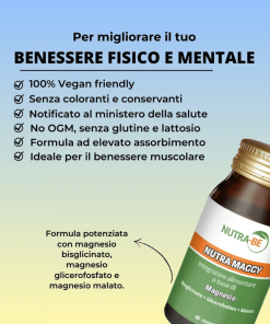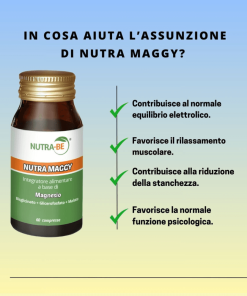 NUTRA MAGGY è un integratore alimentare a base di Magnesio bisglicinato, magnesio glicerofosfato, magnesio malato e vitamina B6.